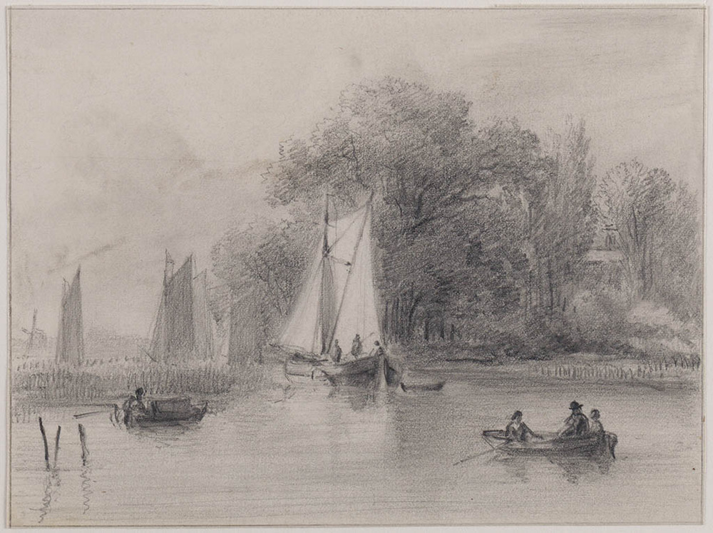 Rivierlandschap, met rechts een huisje tussen de bomen