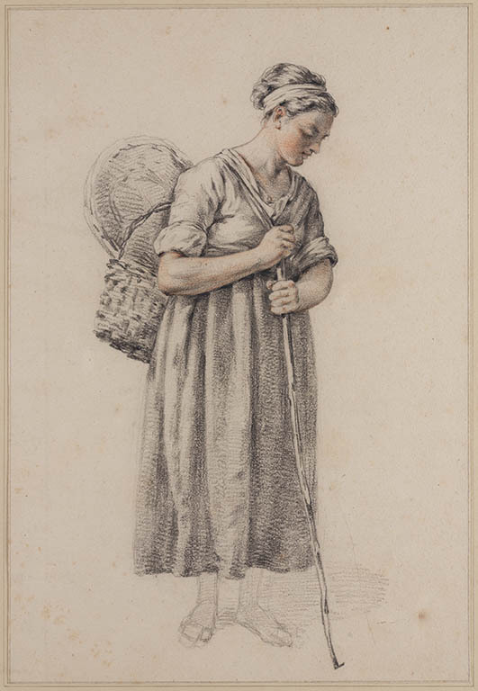 Vrouw met een mand, leunend op een stok