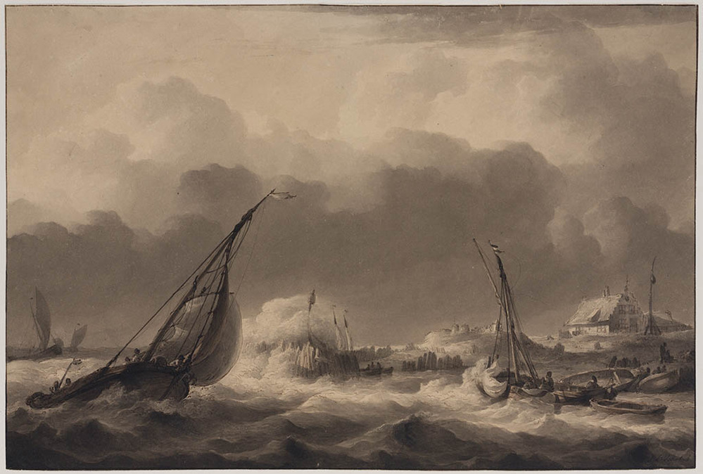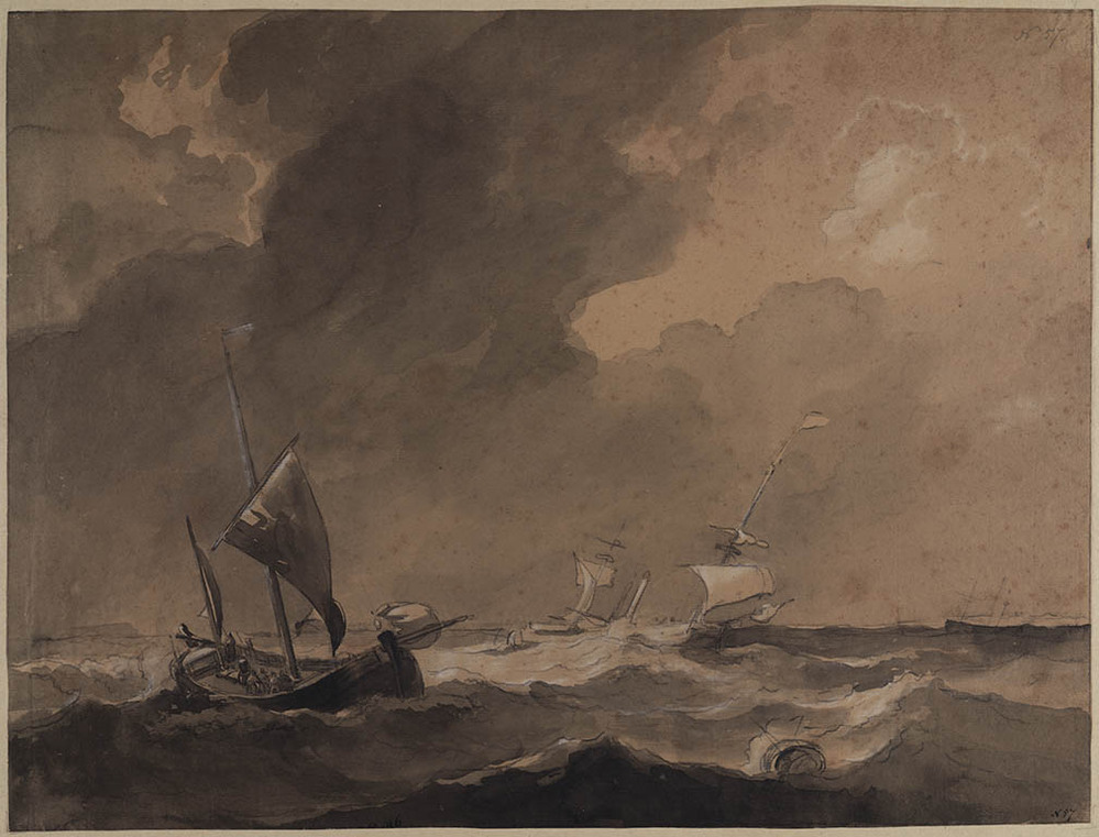 Een fregat en een hoeker bij zware storm