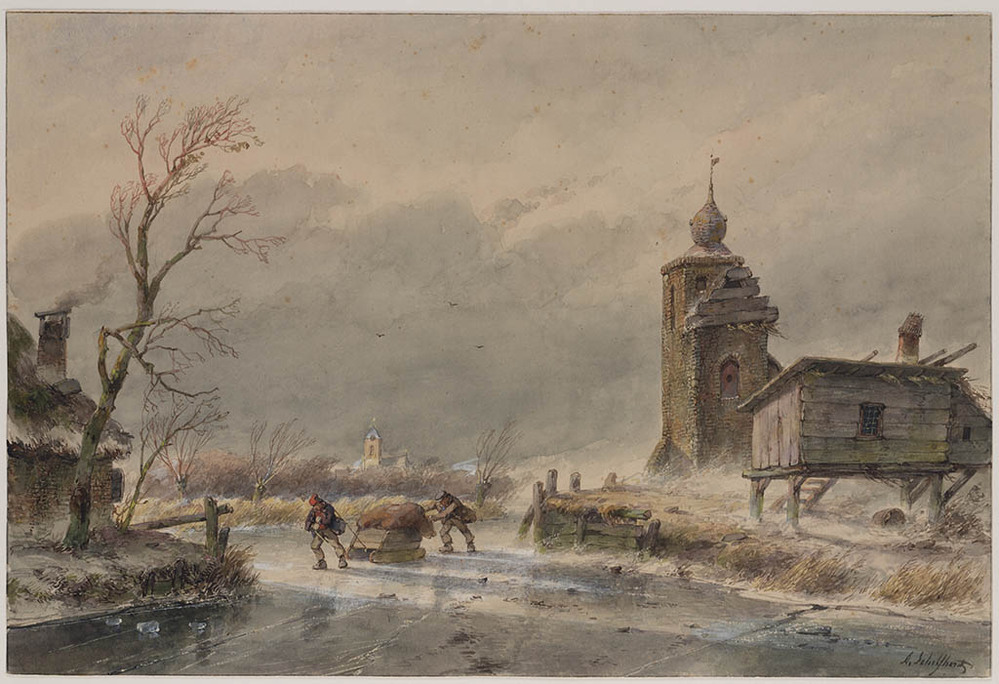 Winterlandschap met figuren in een paardenslee bij e...