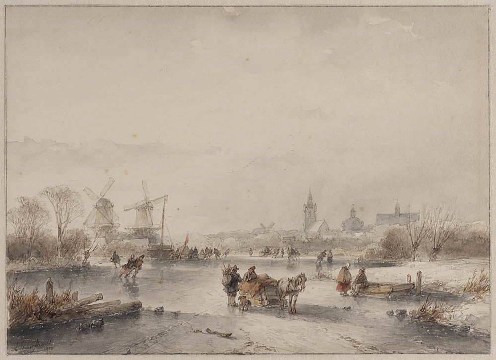 Winterlandschap met figuren op het ijs bij een stad