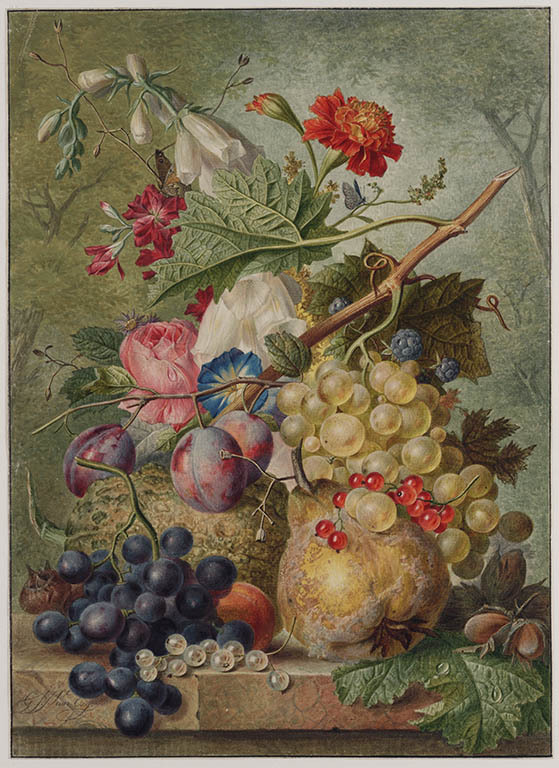 Stilleven met bloemen en fruit