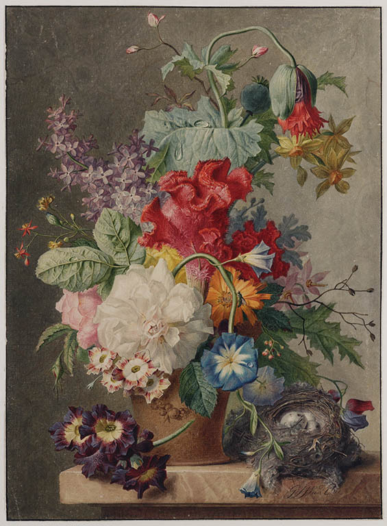 Bloemstilleven met vogelnestje in een nis