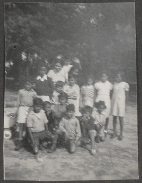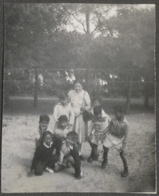 Groepsportret van mannen en vrouwen op een stuk braa...