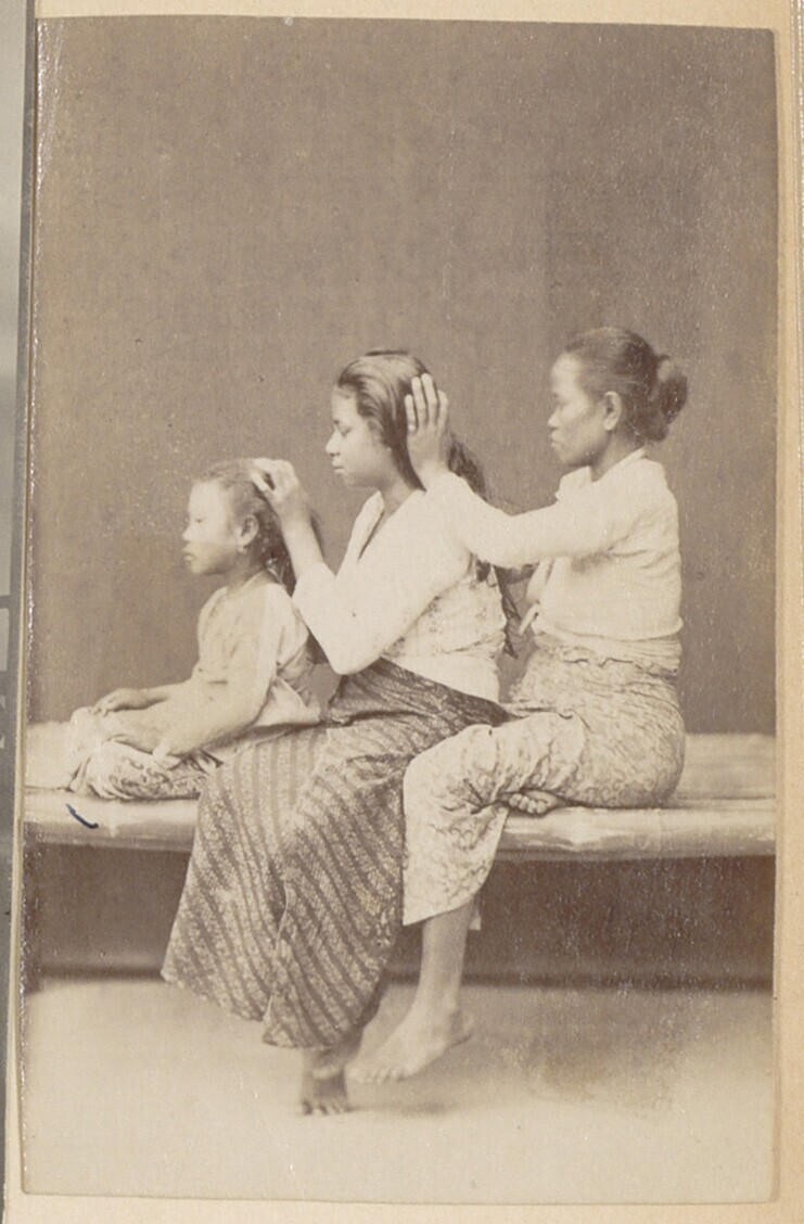 Drie generaties Javaanse vrouwen bezig met haarverzo...
