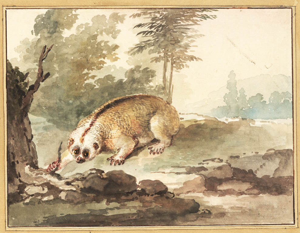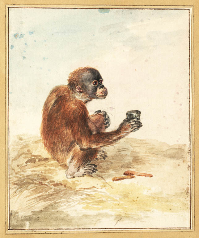 Een jonge Orang-oetan, gehurkt met beker in de hand