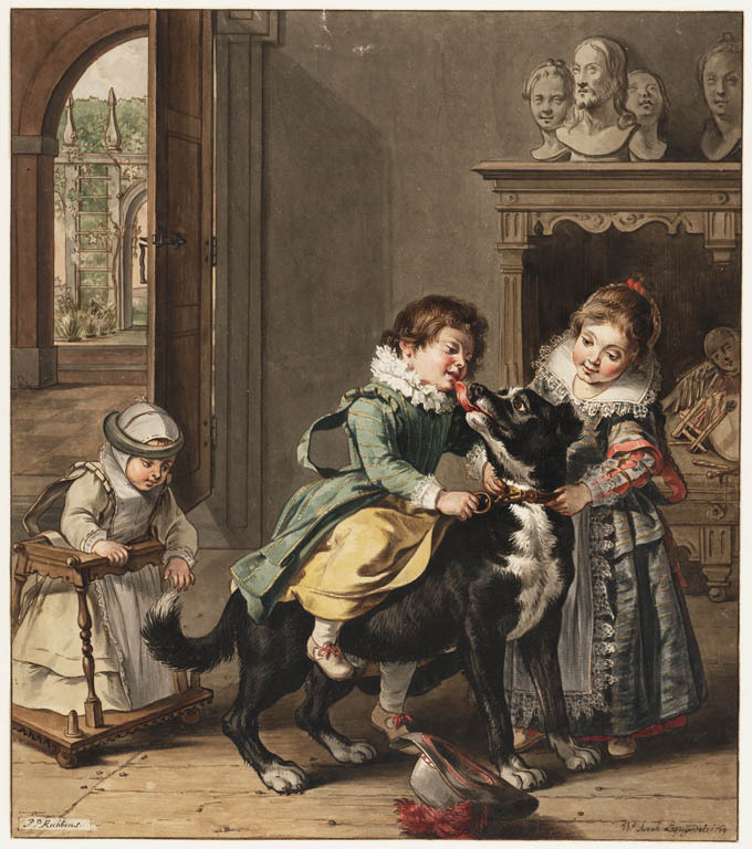Dido die aan de hand van Aeneas de trappen van haar ...