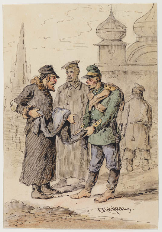 Joodse verkopers met soldaten voor een stadspoort