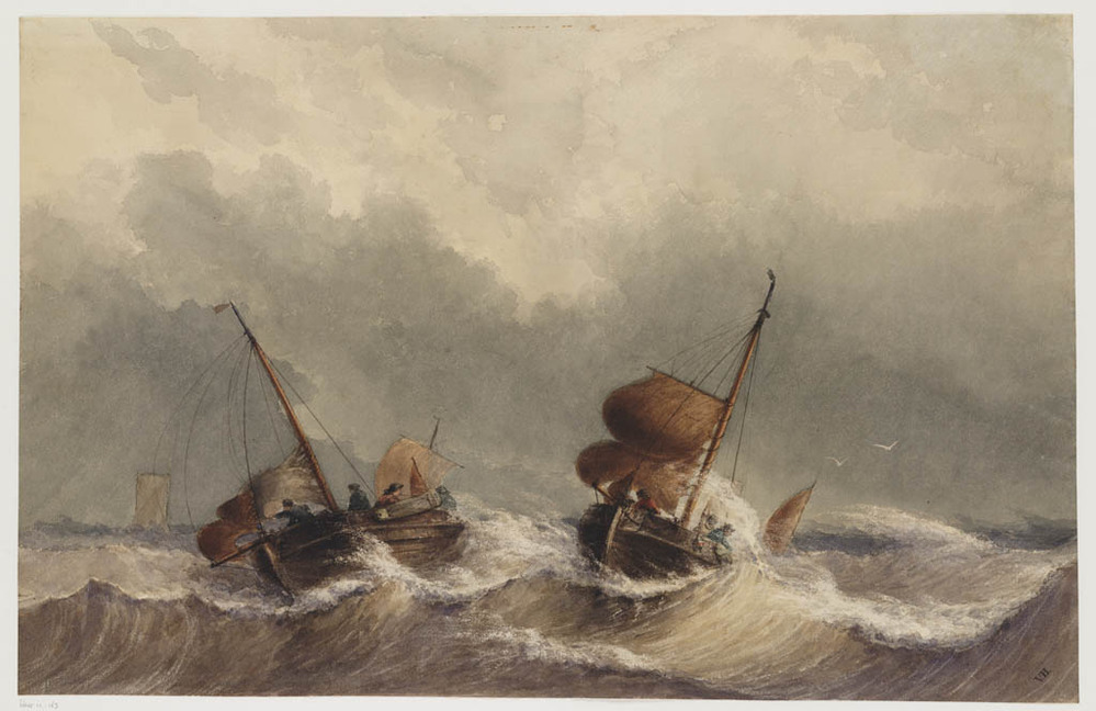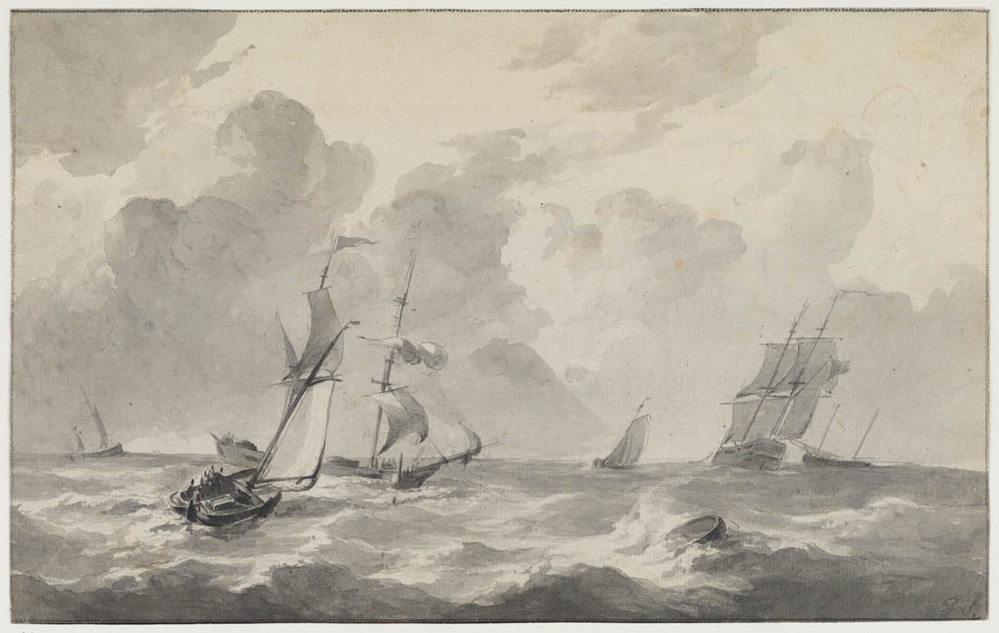 Woelige zee met zeilschepen