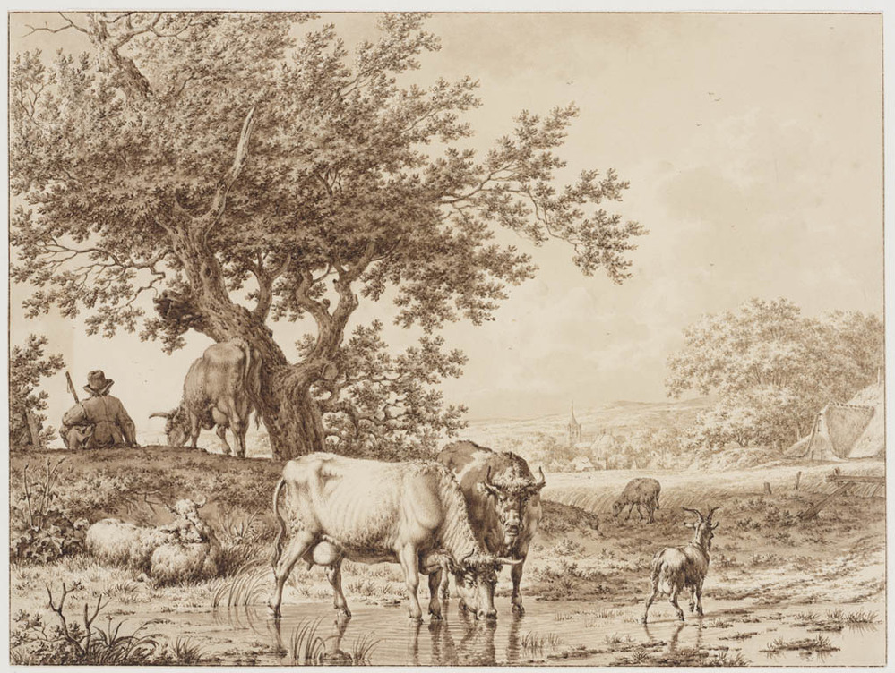 Herder met vee bij plas