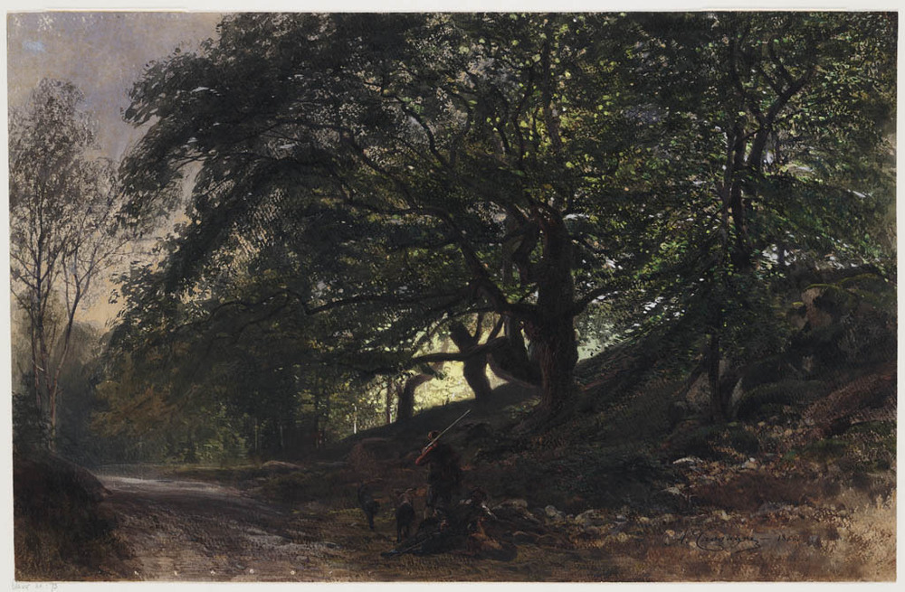 Bosachtig landschap met jagers