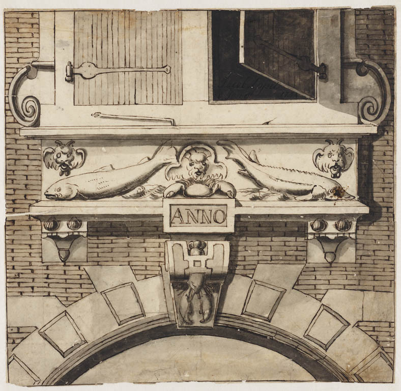 Detail van een gevel en gevelsteen met twee vissen