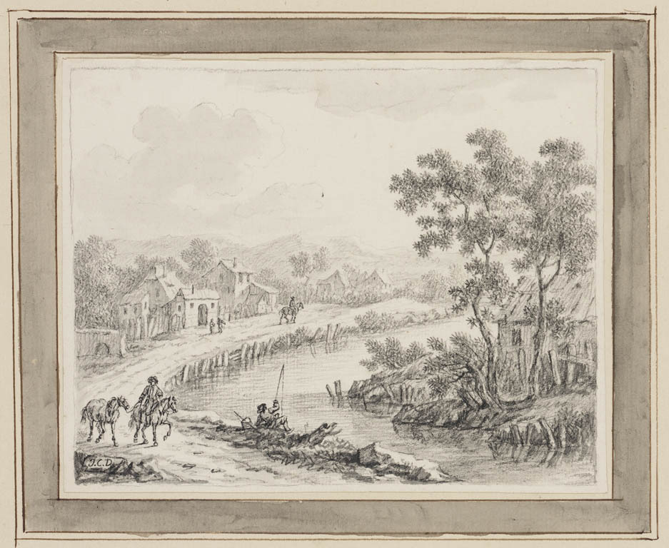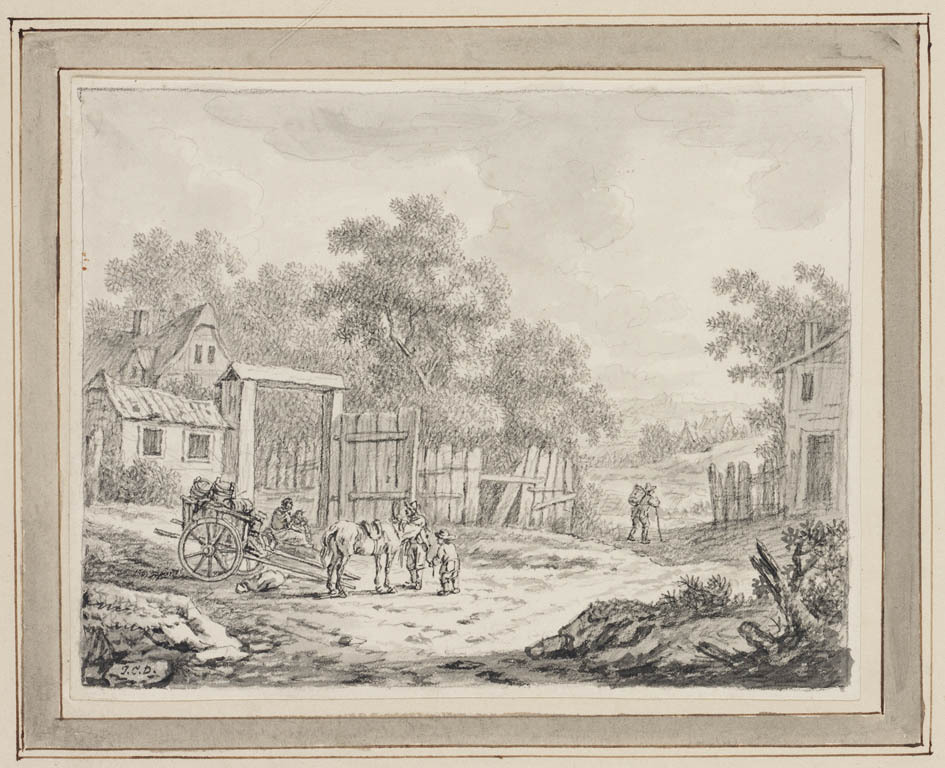 Dorpsgezicht met paard en wagen