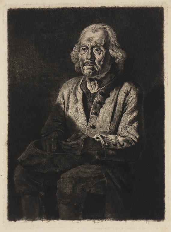 Portret zittende oude bedelaar