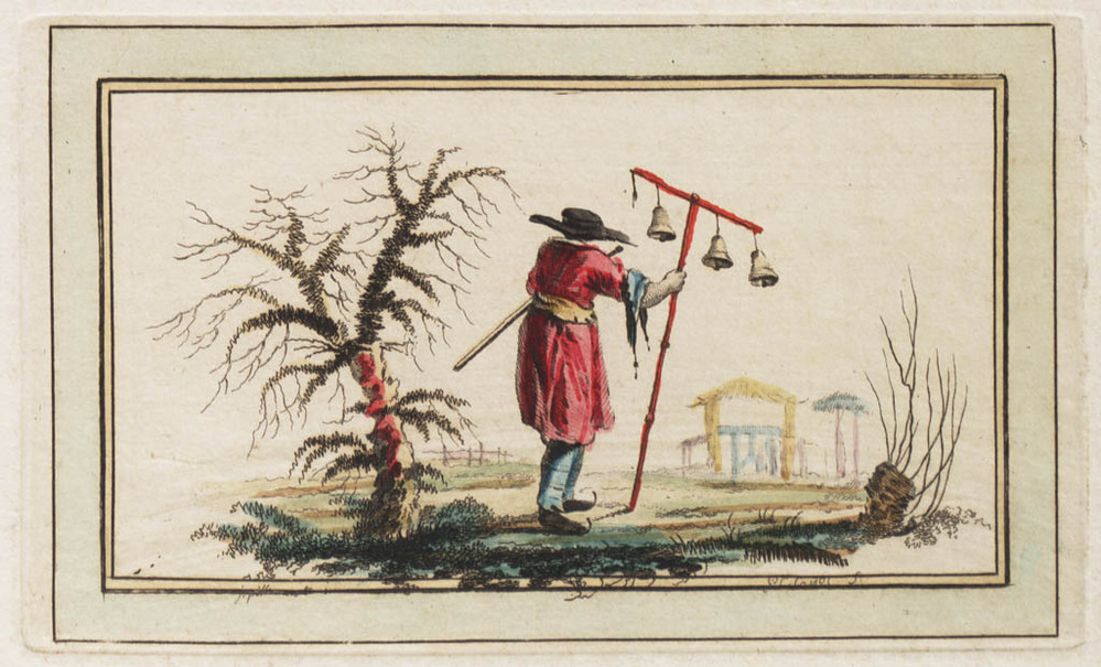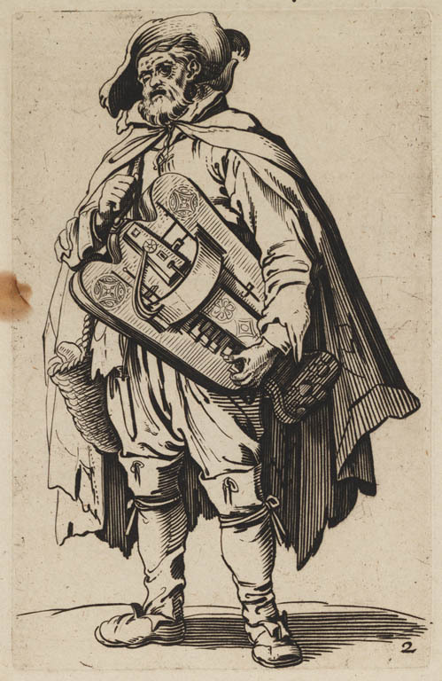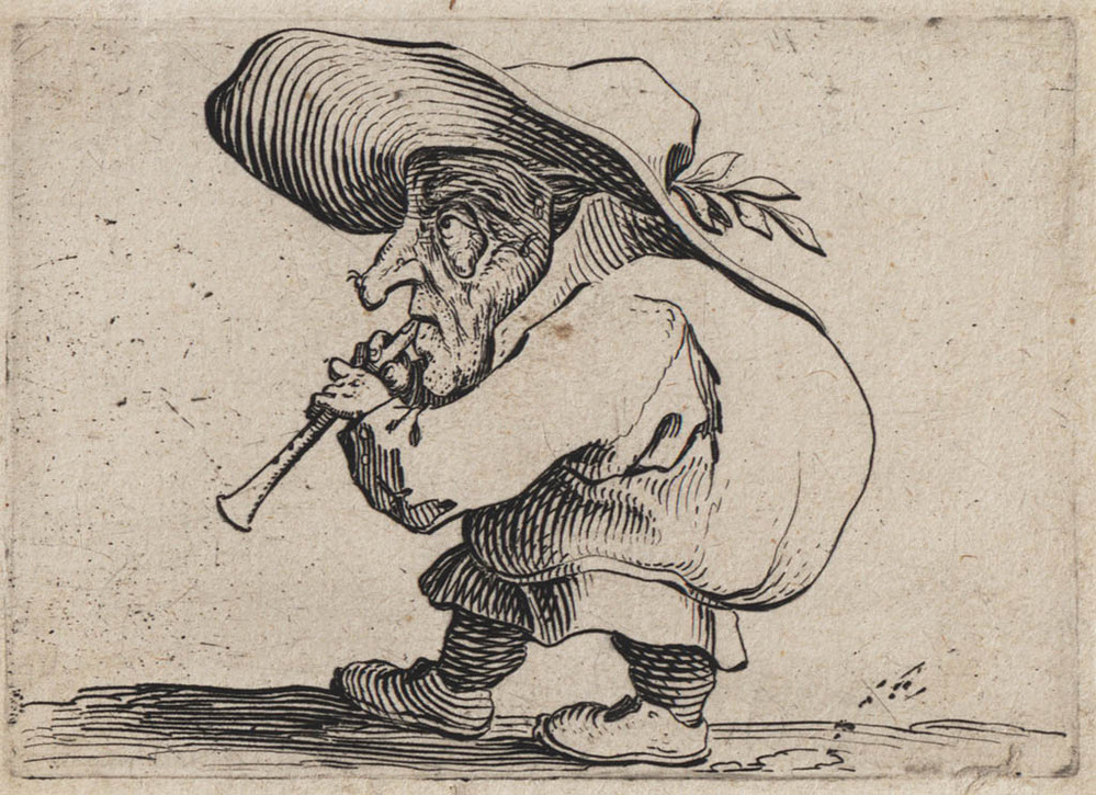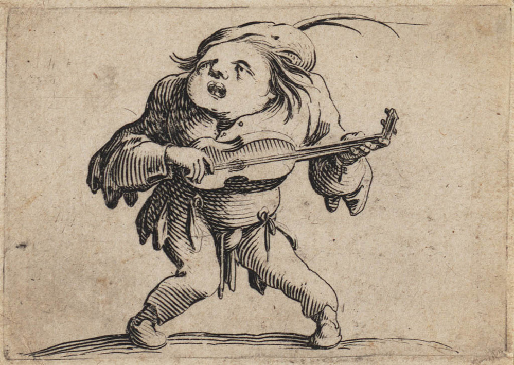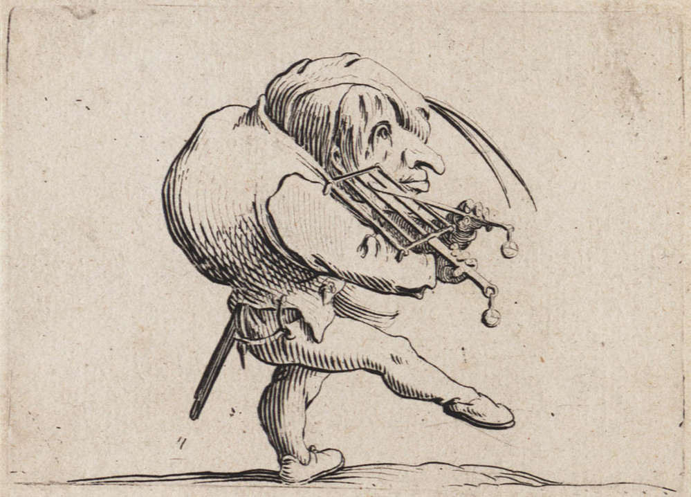 Dwerg met bochel speelt viool op rooster ("Gebocheld...