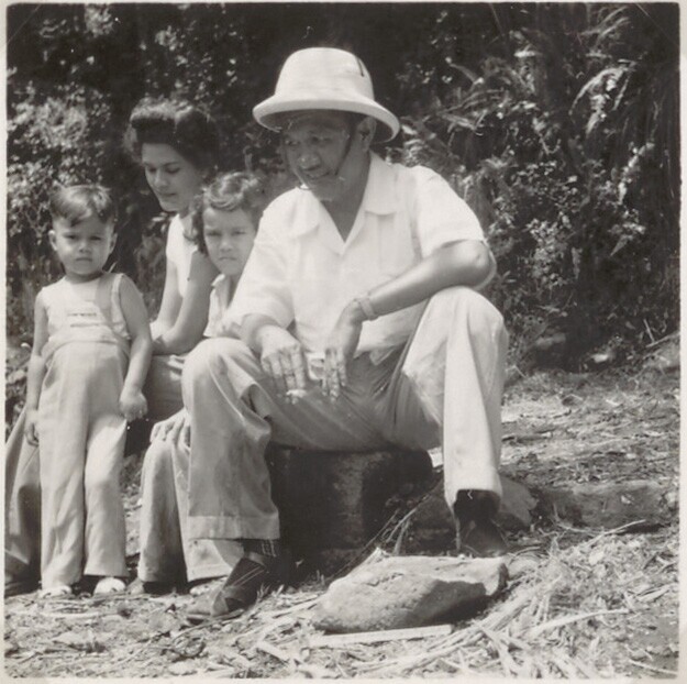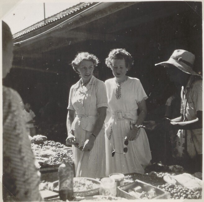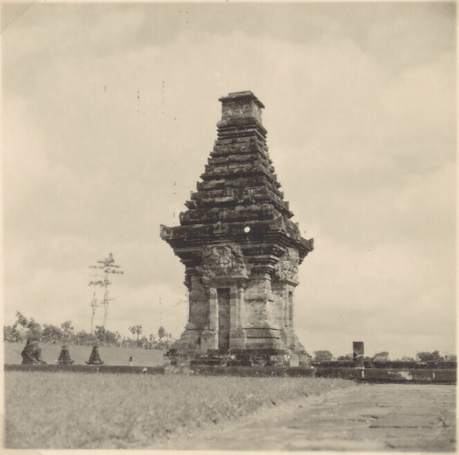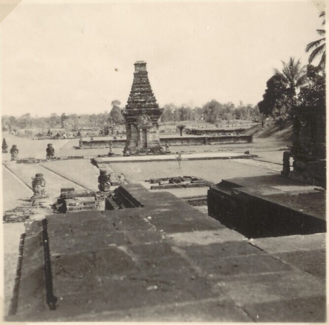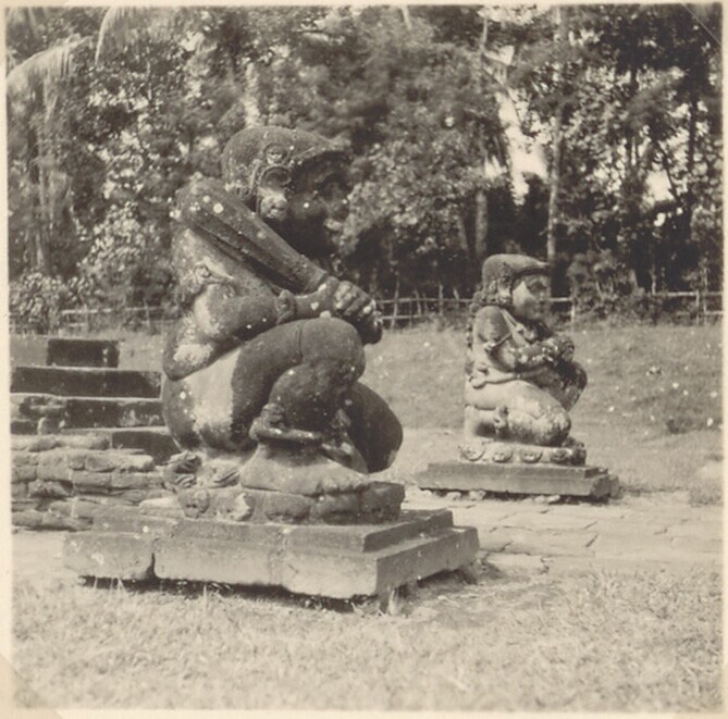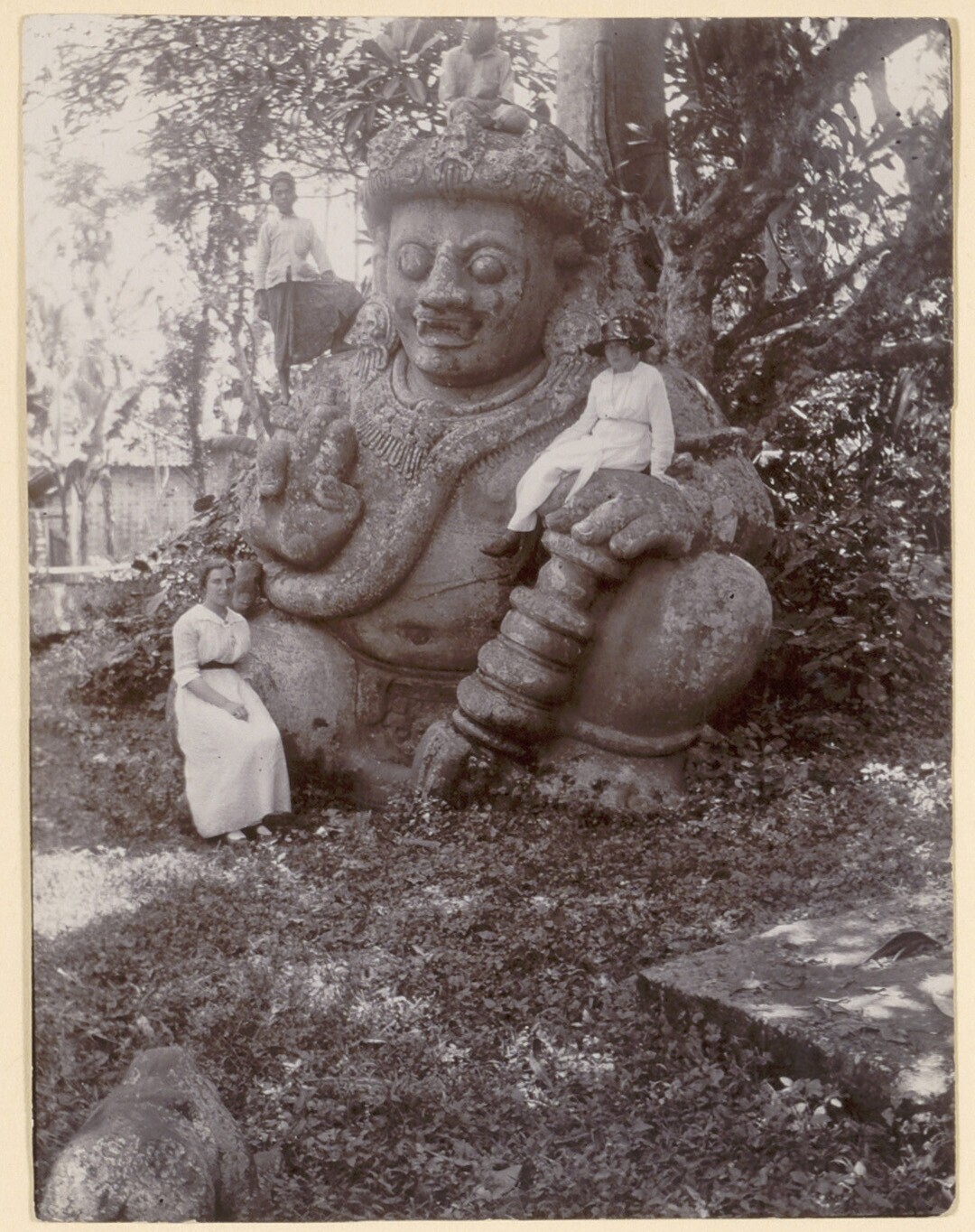 Twee Europese vrouwen en Javaanse kinderen op tempel...