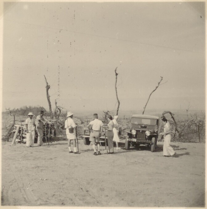 Europese mannen en vrouwen met Jeeps op rustplaats l...