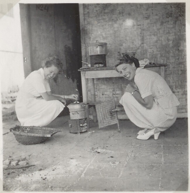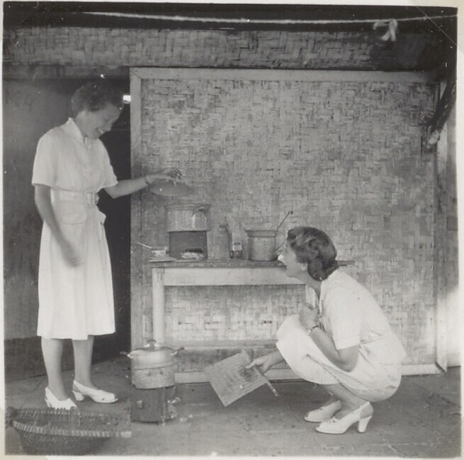 Twee Europese vrouwen in de keuken koken op houtvuur