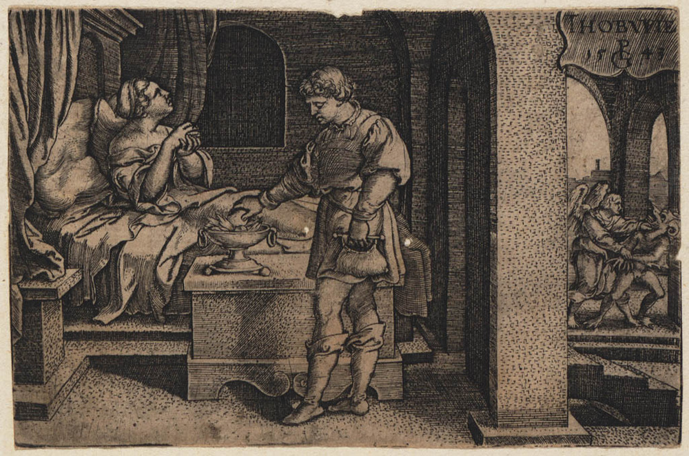 Tobias verdrijft de duivel aan het bed van Sarah met...
