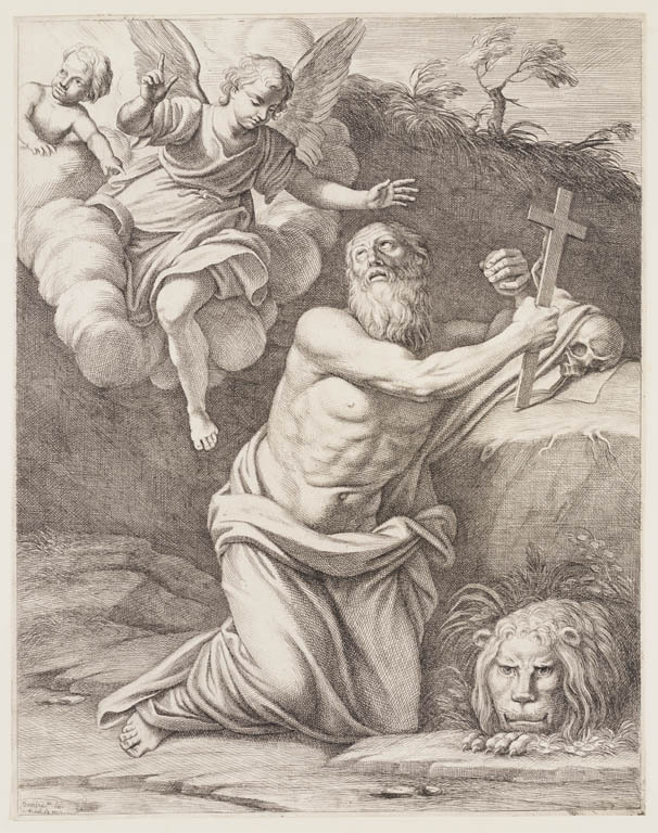 Heilige Hieronymus in de wildernis overdenkt het laa...