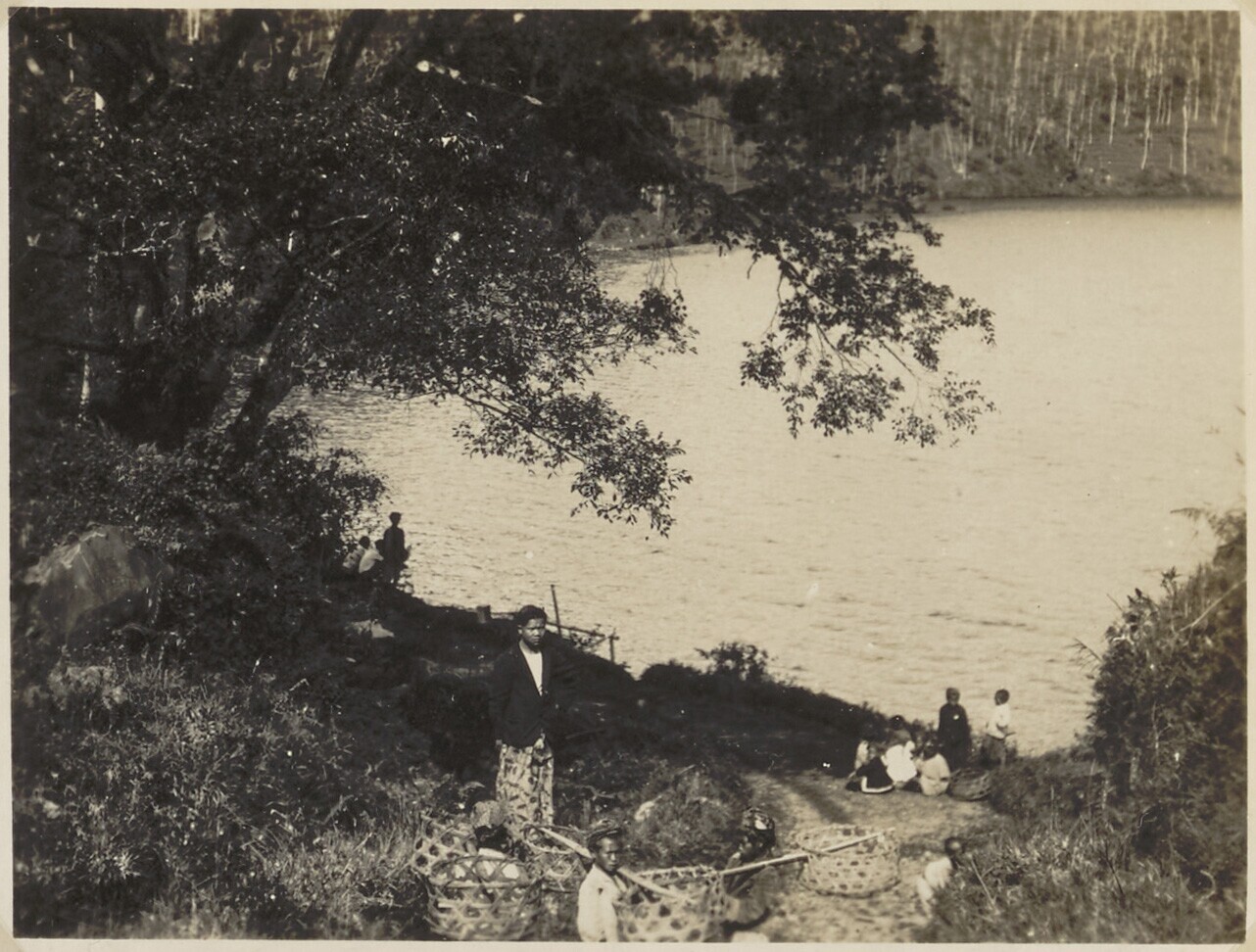 Een groep tabaksdragers die uitrusten bij een meer b...