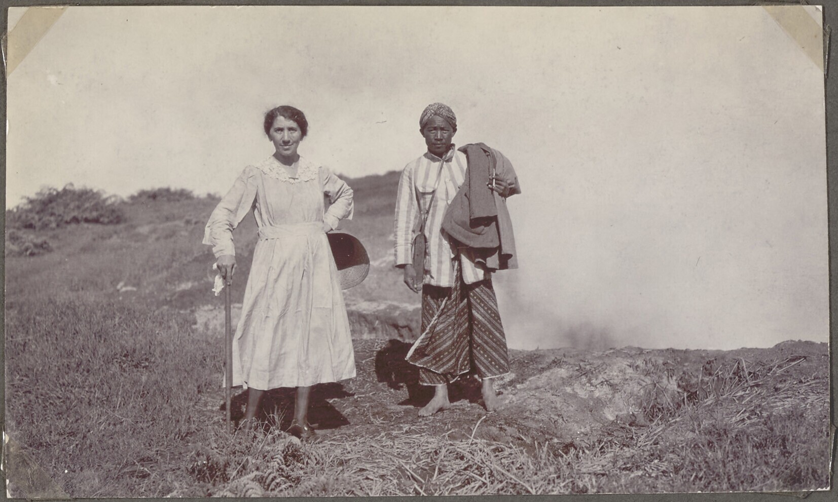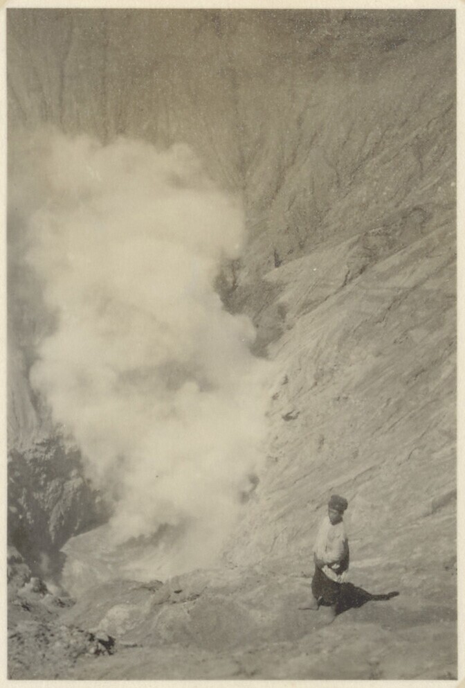 Man met een gids bij zwavelbronnen op het Dieng plateau