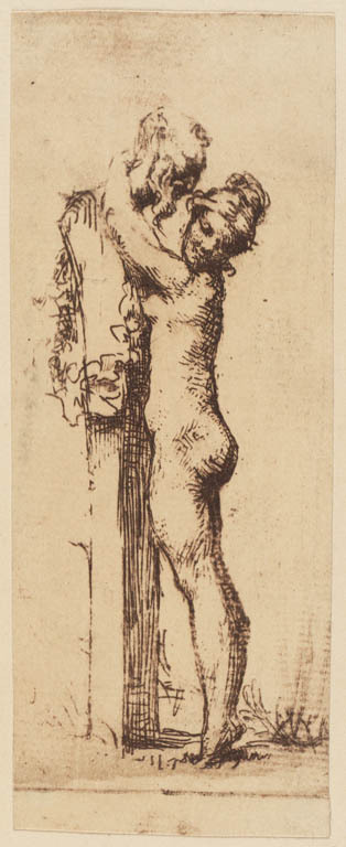 Naakte vrouw omhelst een herme