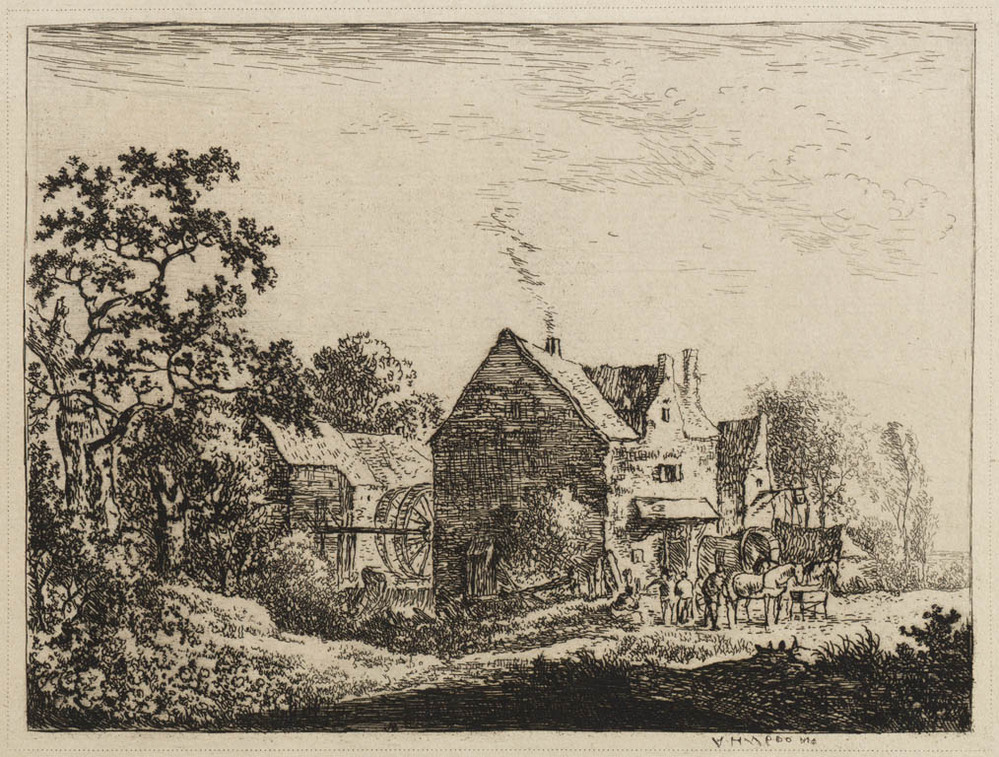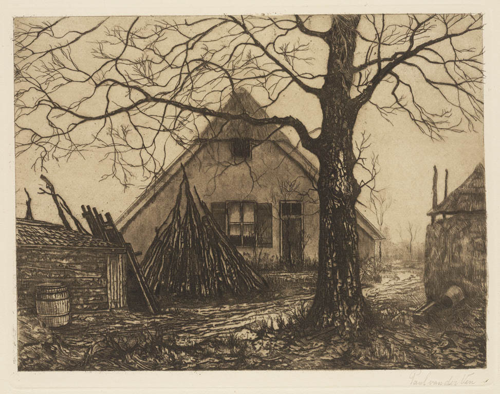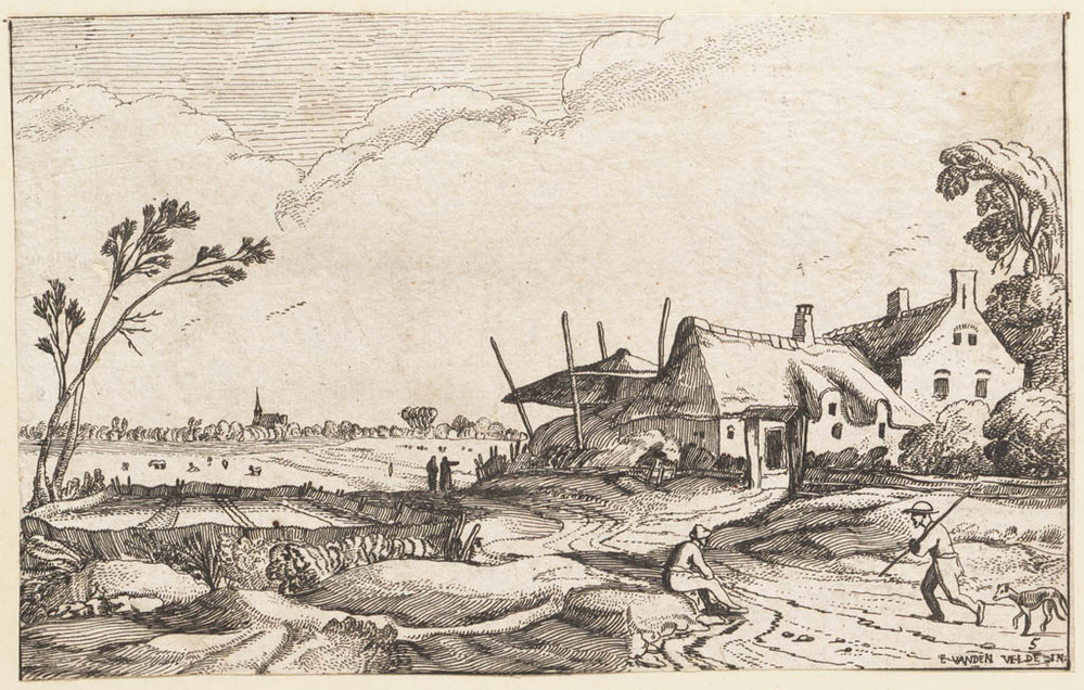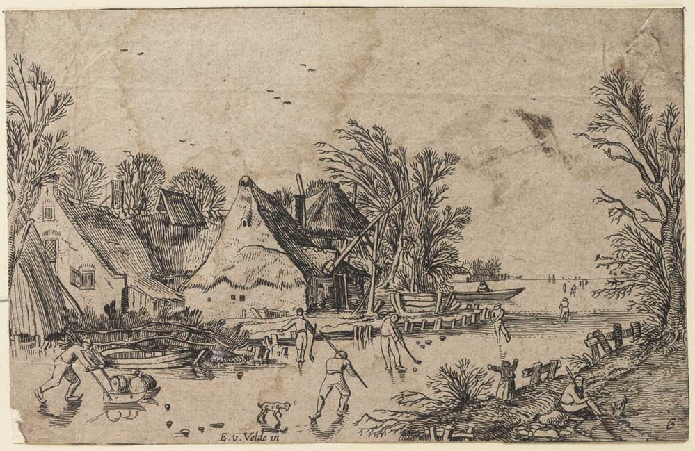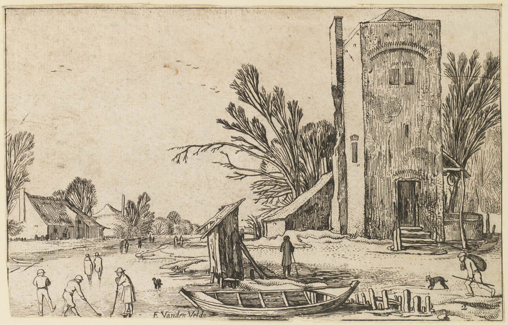 Schaatsenrijders voor boerderijen aan de linkerkant
