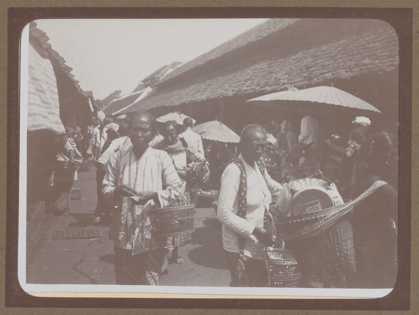 Marktstalletjes met manden en verkopers