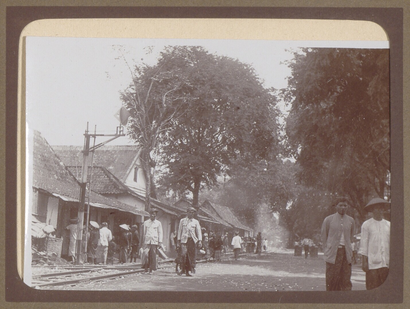 Straatbeeld met passanten en treinrails
