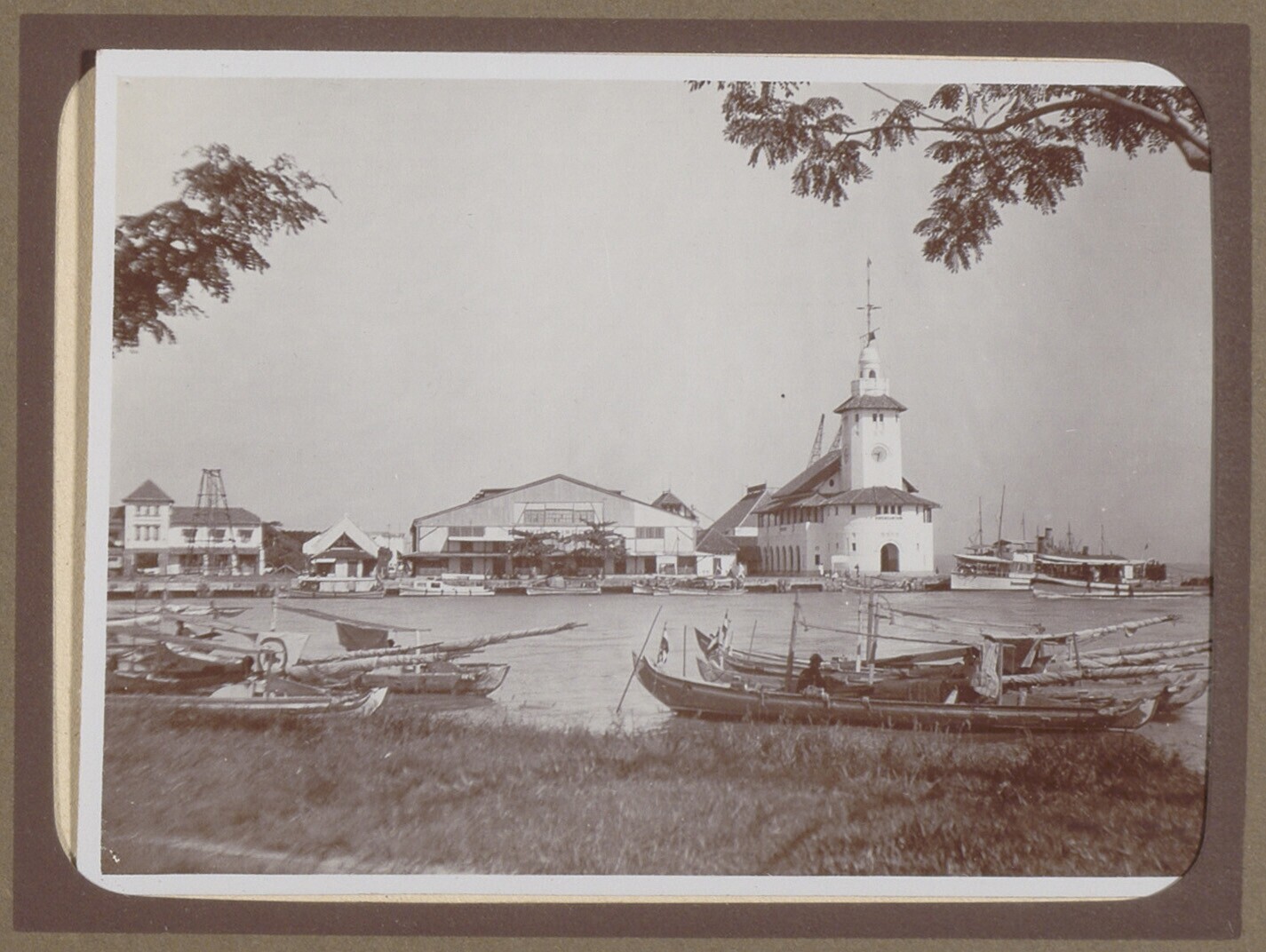 Havengezicht met boten, loodsen en kerk