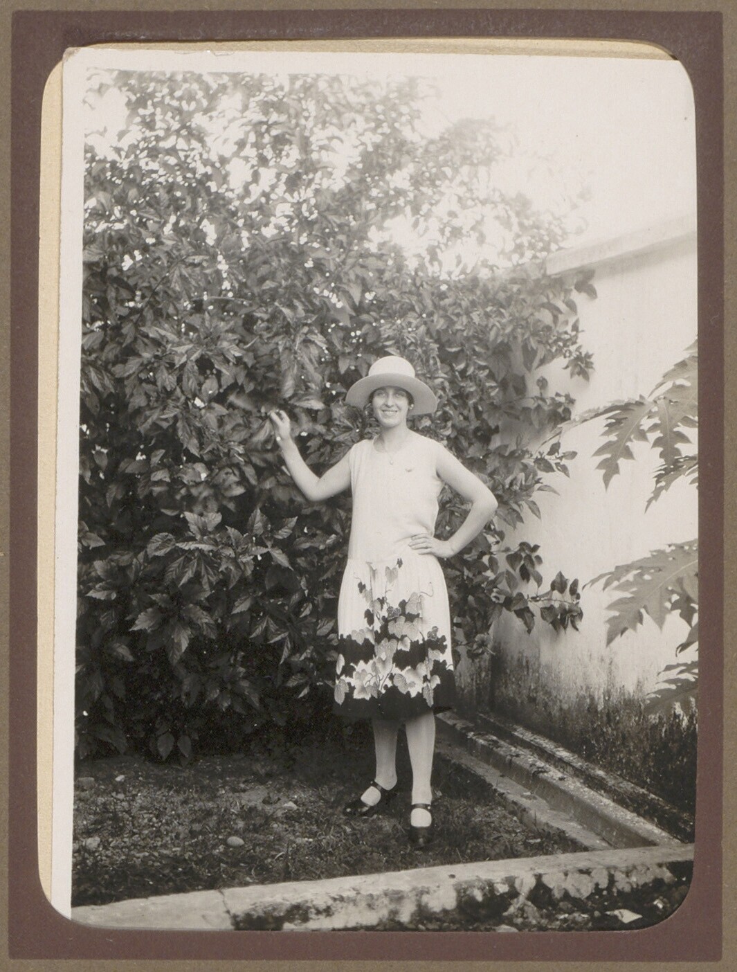 Europese vrouw met hoed bij een struik in de tuin