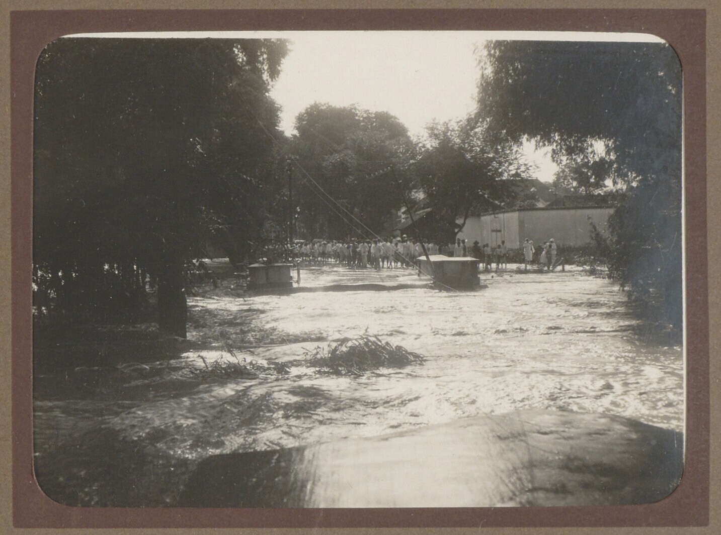 Hoogwater in een dorpsstraat met mensen