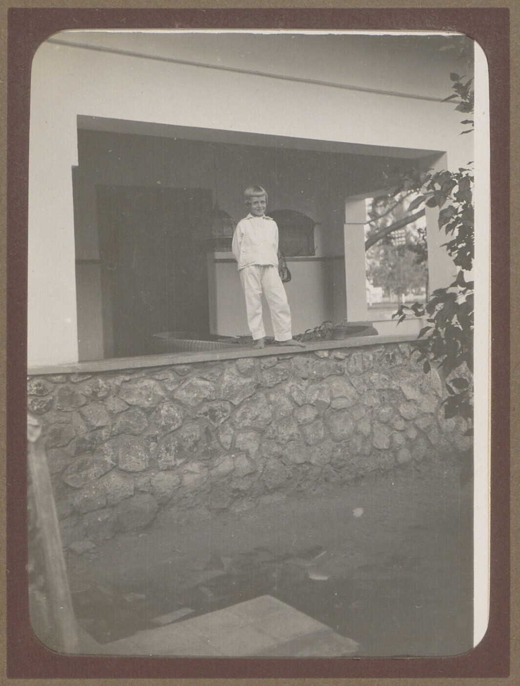 Europees meisje staand op ballustrade van een veranda