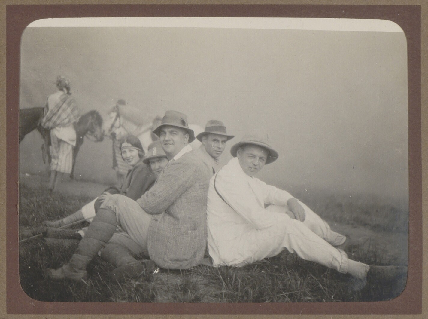 Groep Europeanen zittend op de grond met pony's op d...