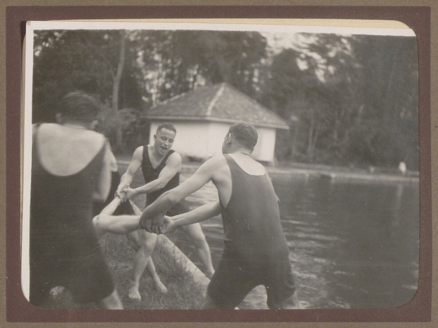 Europese mannen aan het stoeien bij een zwembad