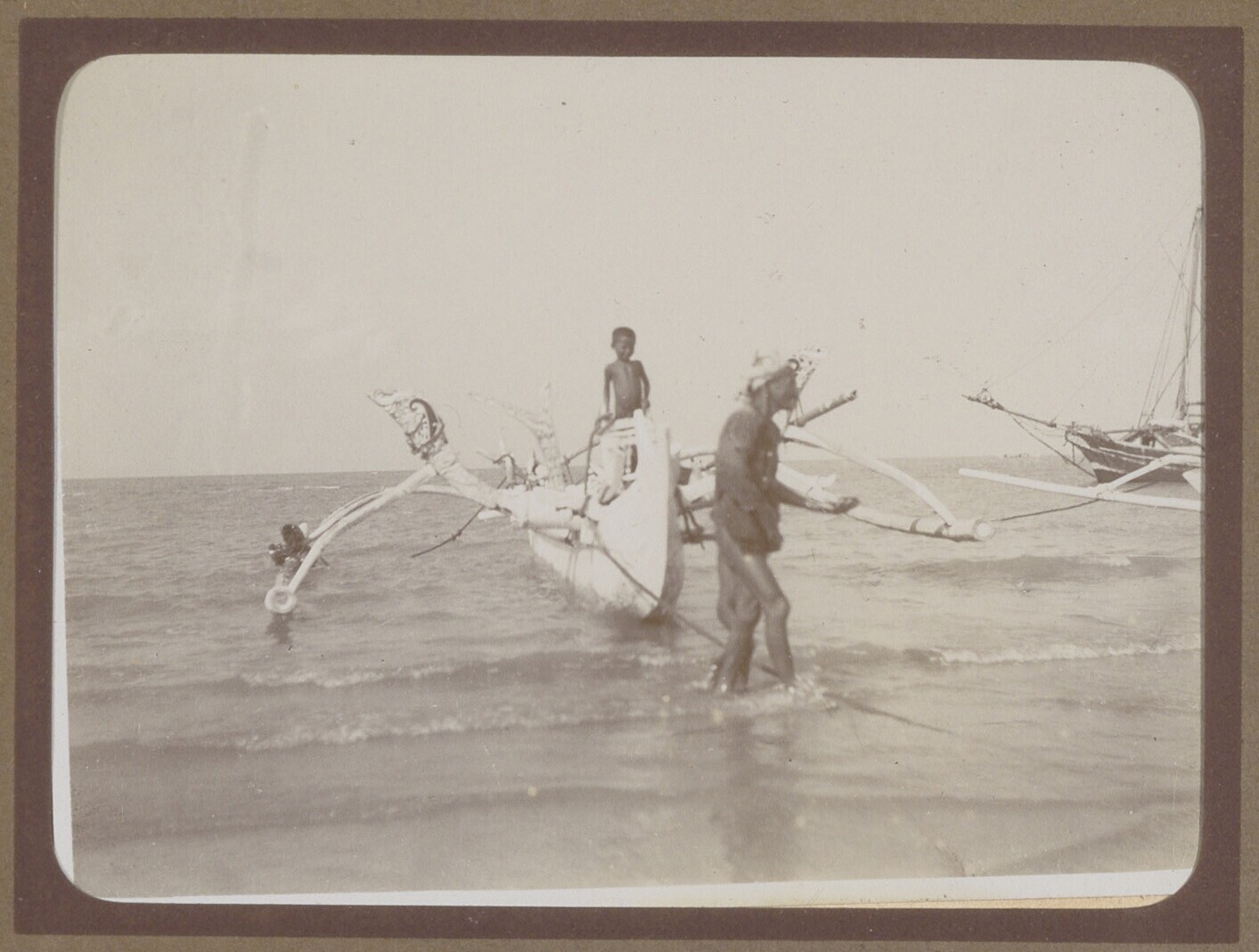 Prauw met uitleggers aan beide zijden, op zee met vi...