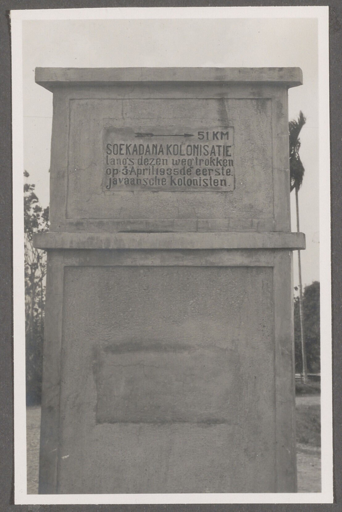 Gedenkteken met tekst ' > 51 km Soekadana Kolonisati...
