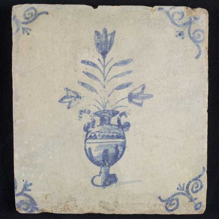 Tegel, bloempot, blauw decor op wit fond, hoekmotief...