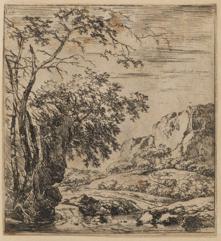 Landschap met rotsen, bomen, een stroom, en steile r...