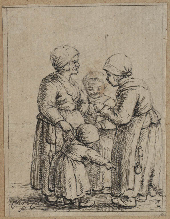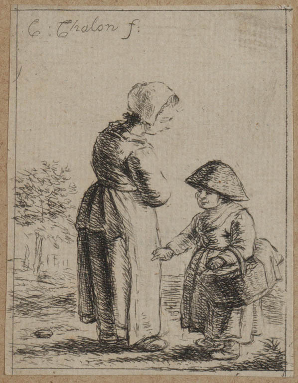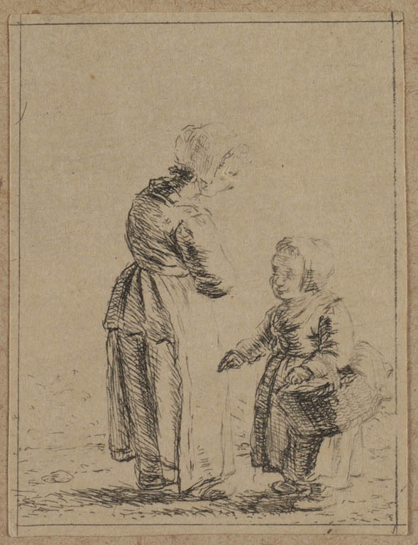 Staande vrouw met kind aan de hand in gesprek met ee...