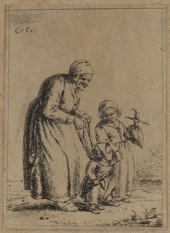Oude vrouw met een kind aan de hand in gesprek met t...