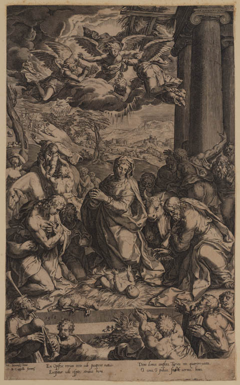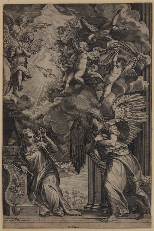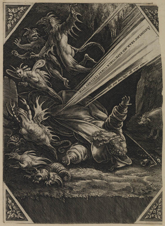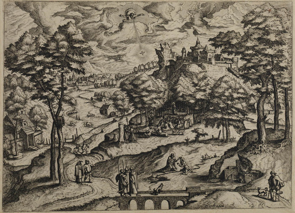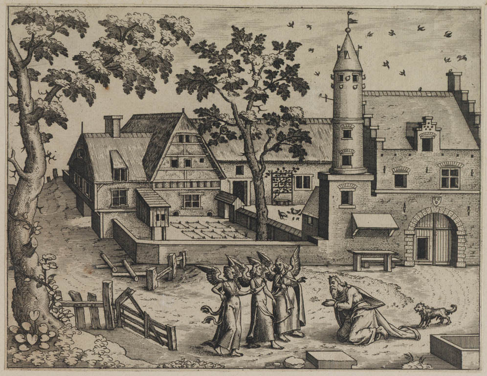 Hieronymus knielt voor drie engelen (uit een serie v...
