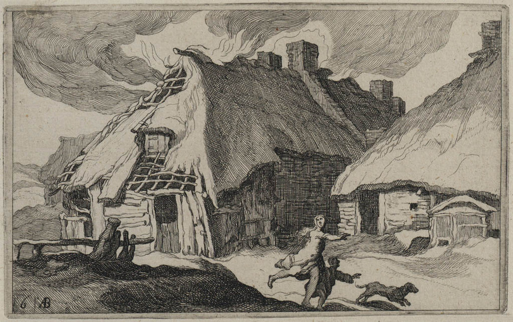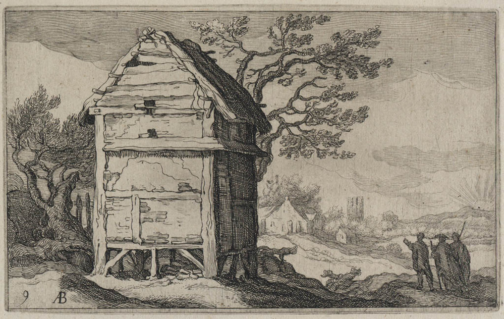 Heuvelachtig landschap met figuren en een schuur