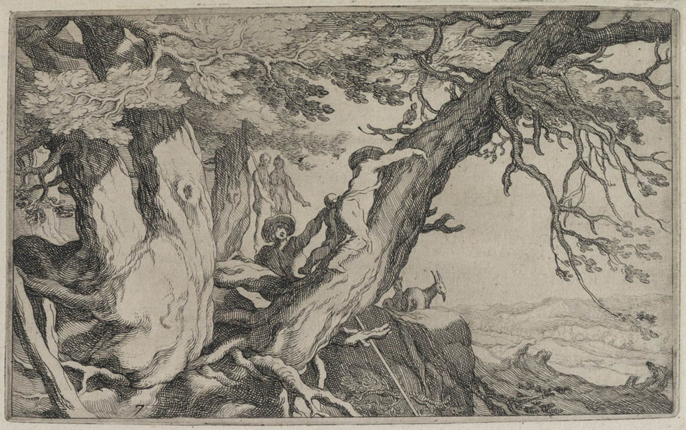 Landschap met boom waarin iemand inklimt