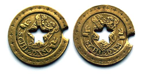 Twee messing gaspenningen, gemeente Schiedam