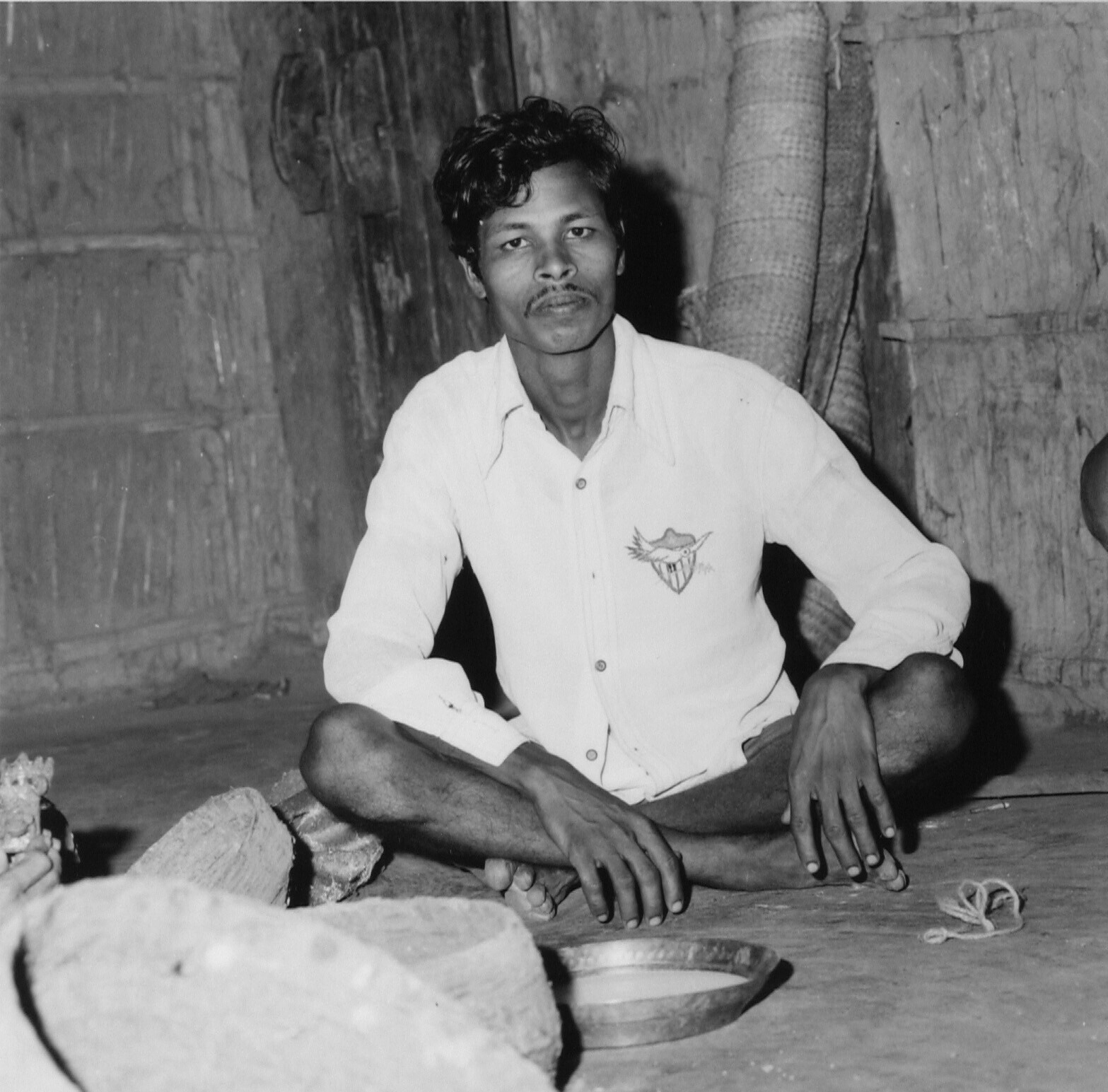 Een zittende man met op de grond voor hem een kopere...