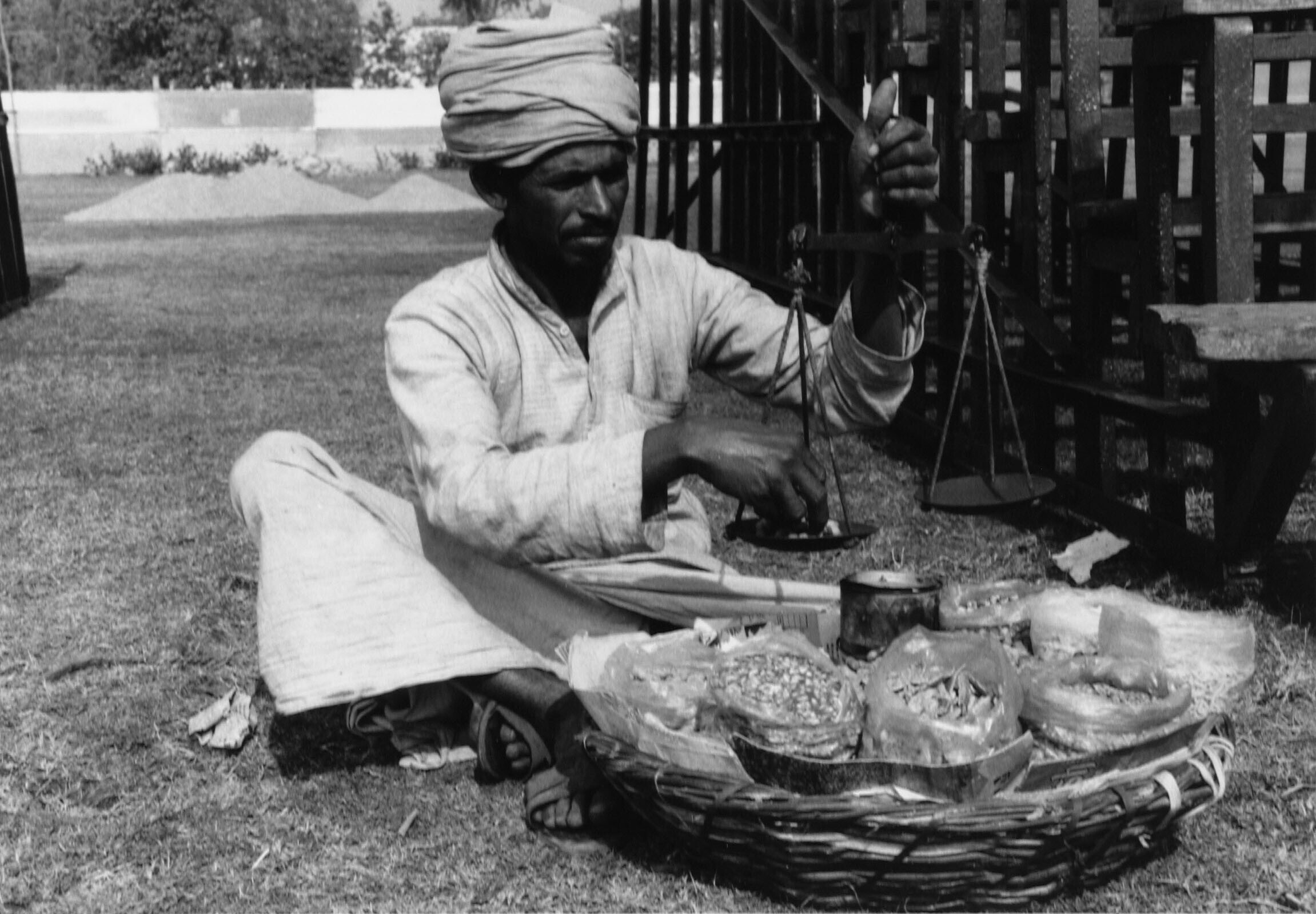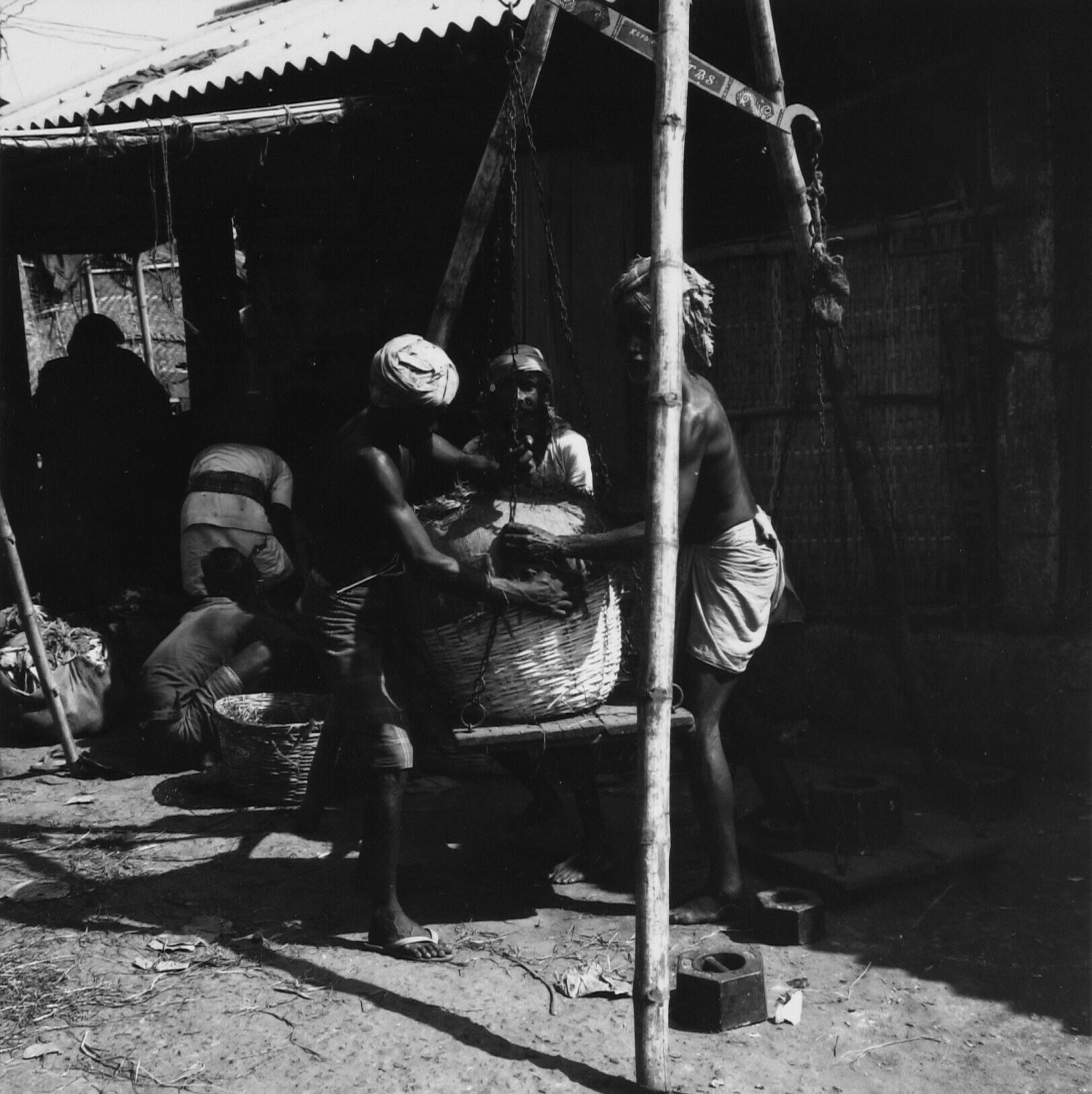 Een weegbrug met drie bamboestokken op de groentenmarkt