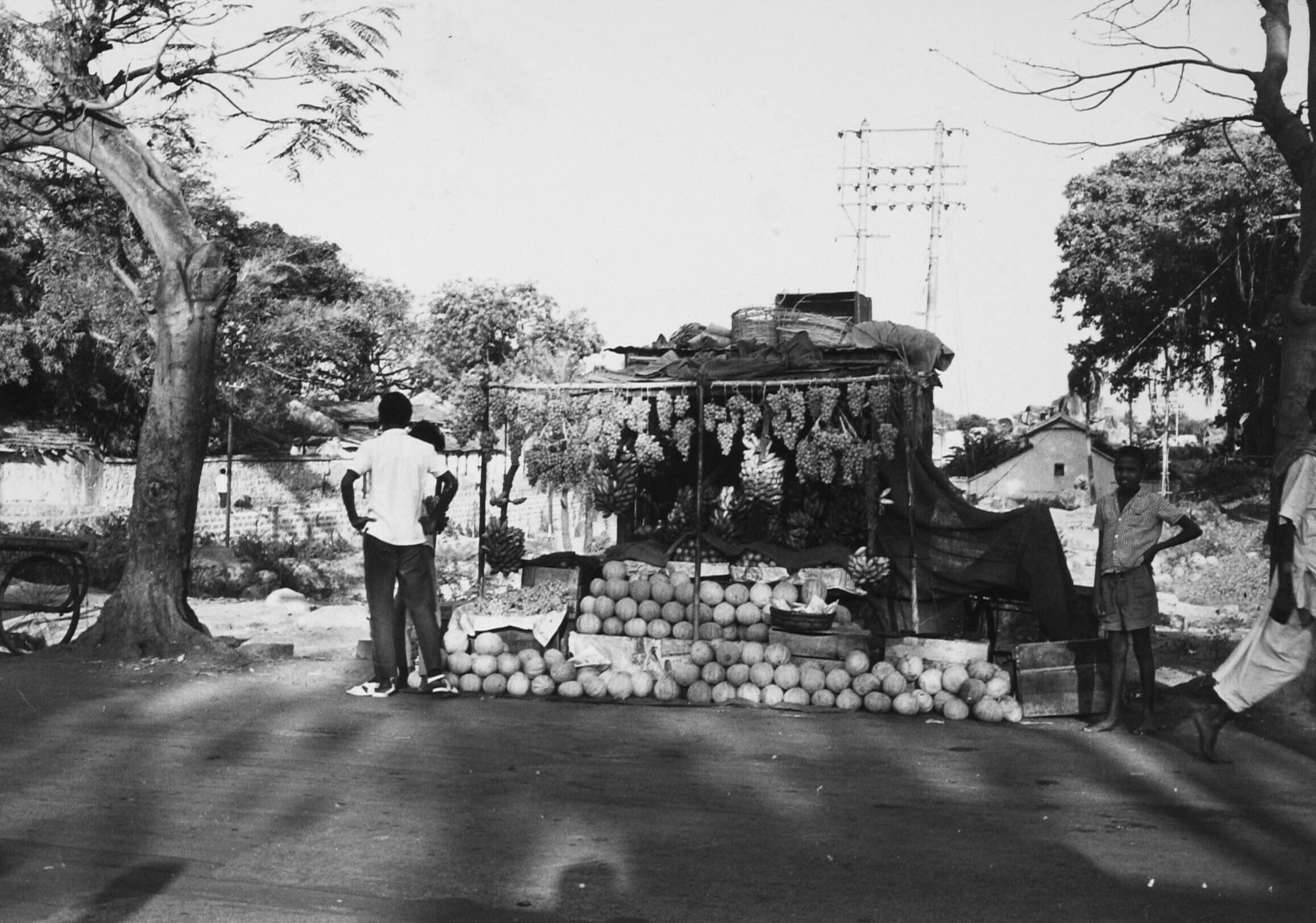 Straatbeeld met op de voorgrond een fruitverkoper me...