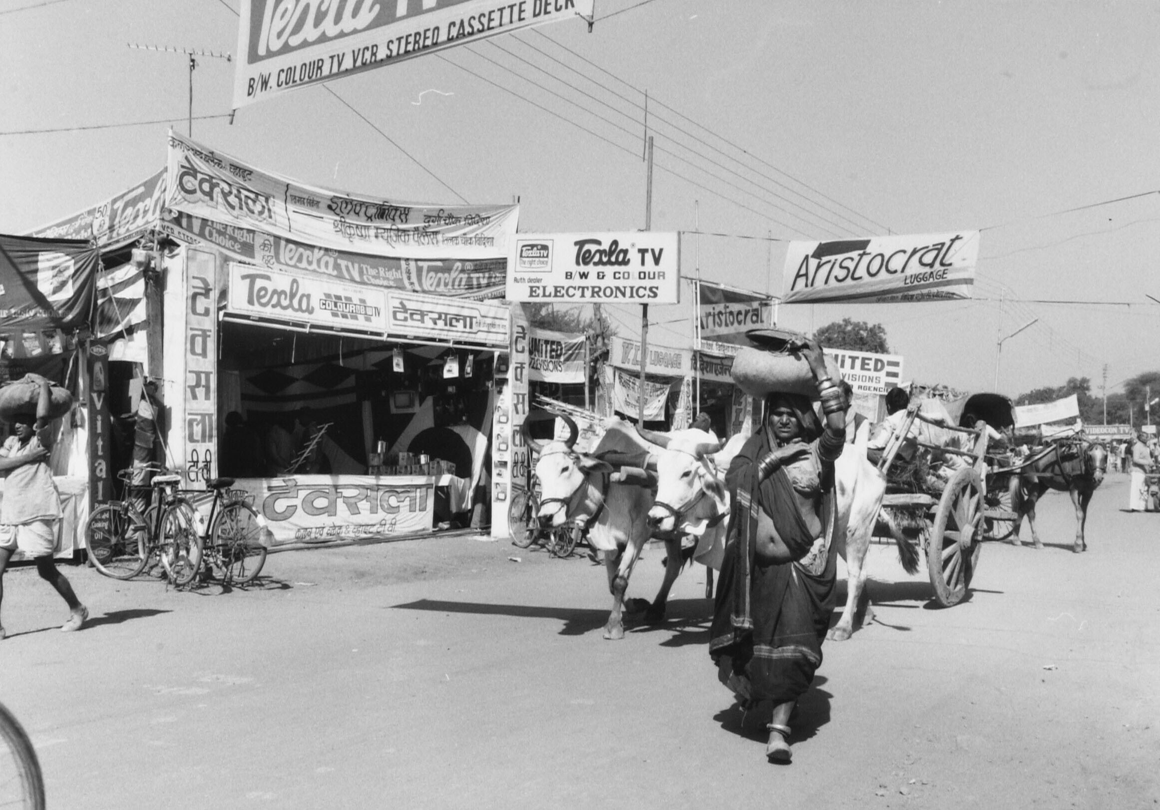 Straatbeeld met op de voorgrond een waterverkoper di...